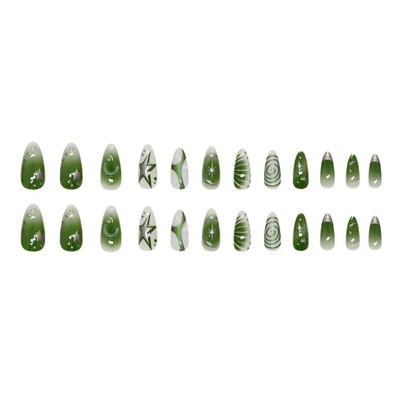 Elevate your nail game with these 24 summer green almond press-ons that scream Y2K rebellion. Featuring bold star prints and an edgy aesthetic, these false nails deliver instant impact without the salon commitment. The reusable design means you can switch up your look whenever the mood strikes—perfect for fashion-forward women who refuse to play it safe. Simple application, maximum attitude. Own your style.